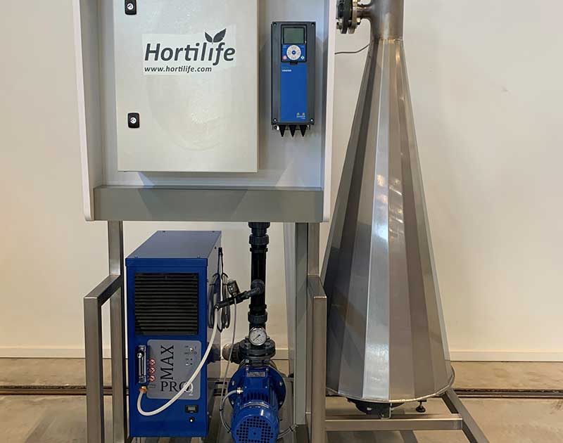 La unidad Vortex limpia el aire en busca de oxígeno. A través de la tecnología de vórtice, pendiente de paten te, aplica fuerza al oxígeno, pulverizando el O2 en el agua de riego y creando burbujas en tamaño nano. Al hacer esto, el O2 permanece en suspensión incluso cuando pasa por varios procesos de un sistema de riego.